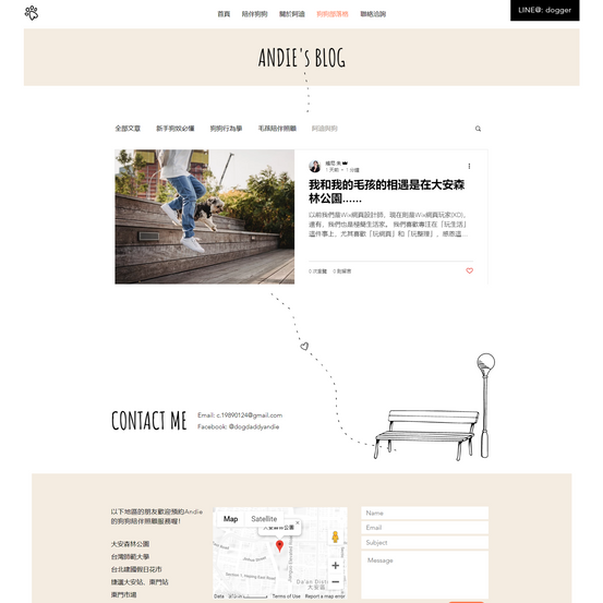 (4) 把「LINE@: dogger」改掉,點擊2下編輯文字即可。如果沒有LINE@,也可以放上Instagram或Facebook等其他帳號,它會是出一直在網頁的右上方的,方便讀者隨時可以聯絡。